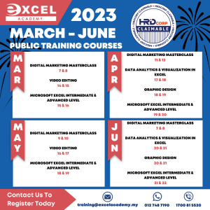 Looking to improve your workforce skills and career to the next level? Unlock your workforce’s full potential with our HRD Corp Claimable courses! Our expert-led public training sessions cover a wide range of topics, such as Microsoft Excel Training, Data Analytics & Visualization in Excel, Video Editing, Graphic Design and Digital Marketing that you might need.