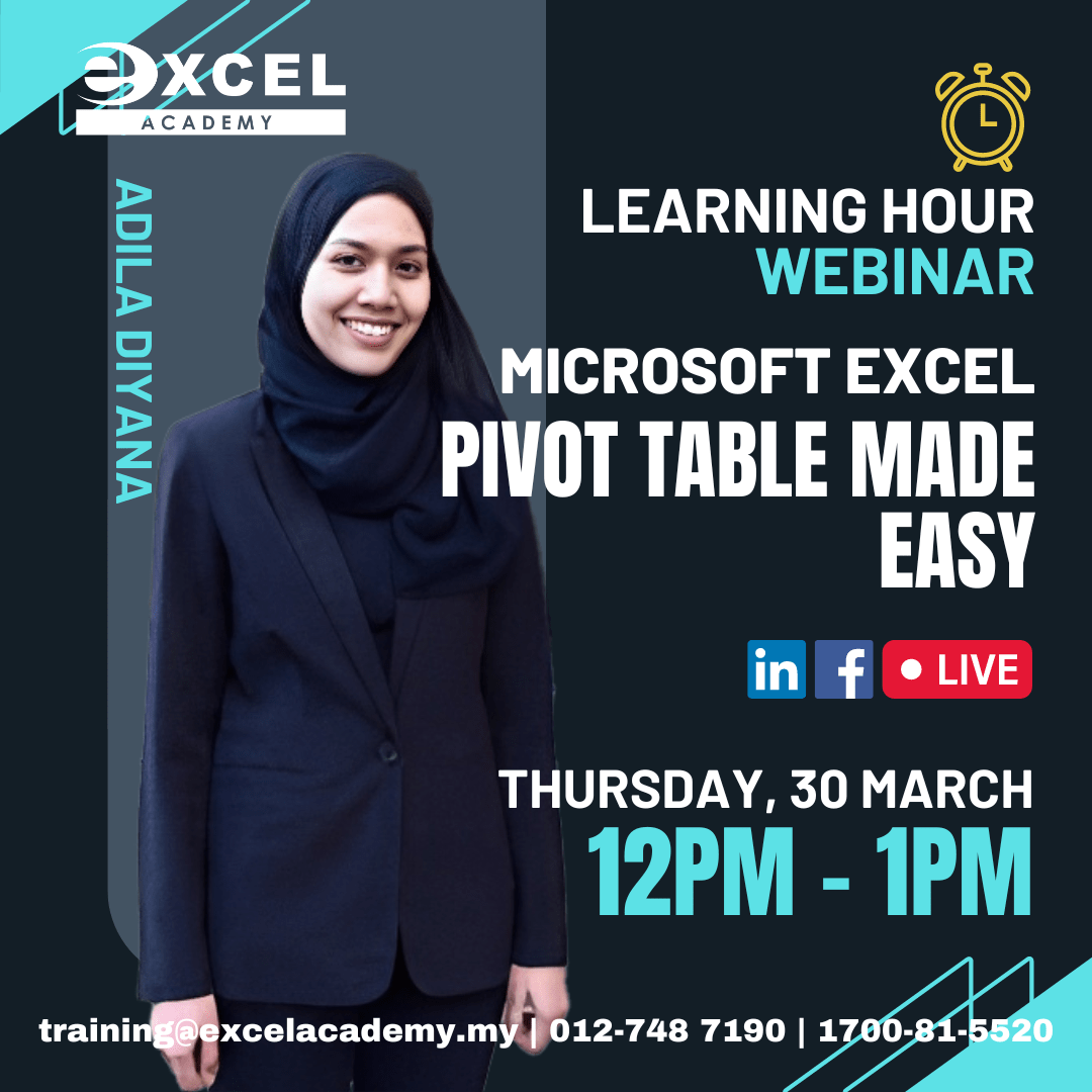 π€ Are you looking to improve your data analysis skills in Microsoft Excel? Do you want to learn how to simplify your data analysis and reporting with pivot tables? Join us for our upcoming webinar on Microsoft Excel – Pivot Table Made Easy with Ms. Adila Diyana!β£